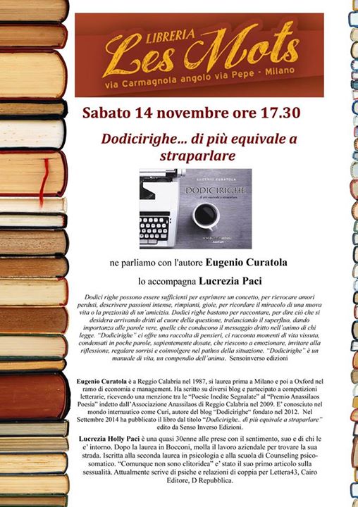 Ed ecco, potete trovarmi in carne ed ossa Sabato 14 Novembre alle ore 17.30 alla Libreria Les Mots in Via Guglielmo Pepe, 14, 20159 (vicino la stazione di Porta Garibaldi).